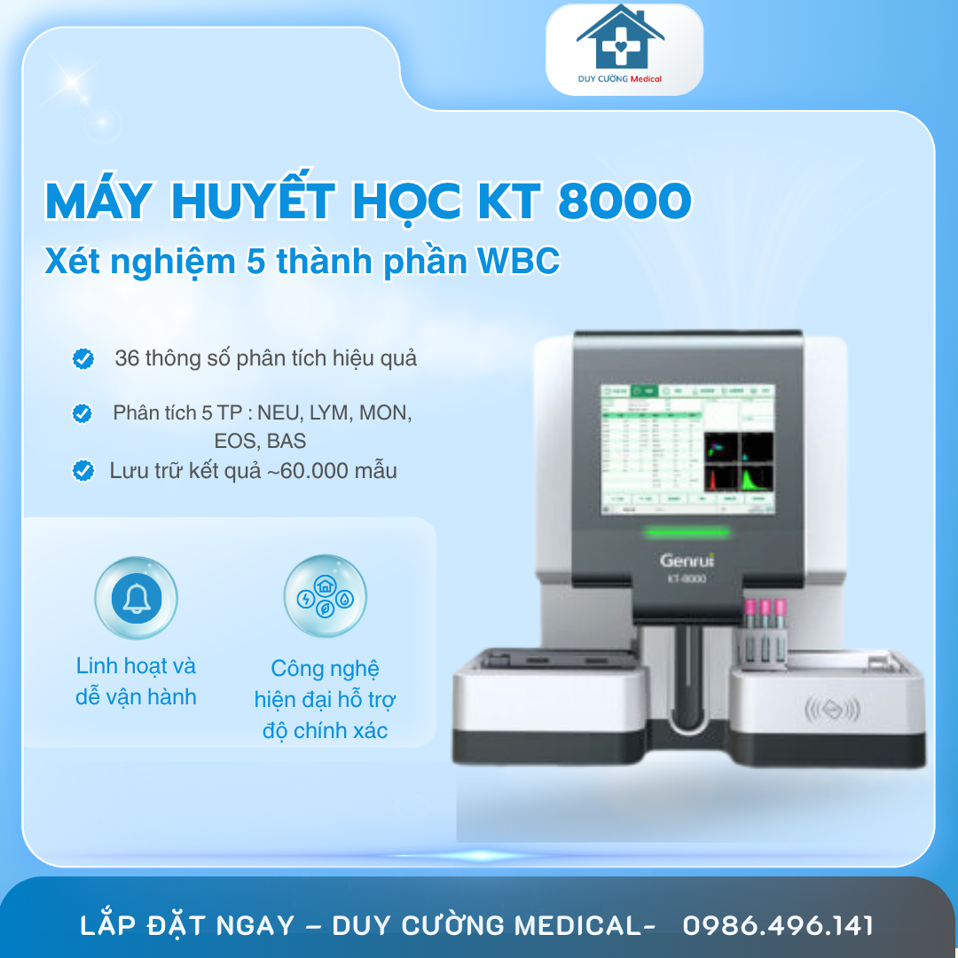 Máy xét nghiệm huyết học KT-8000 là một trong những dòng máy phổ biến tại các phòng khám, phòng xét nghiệm và bệnh viện hiện nay nhờ khả năng phân tích nhanh, độ chính xác cao và vận hành ổn định. Tuy nhiên, để máy hoạt động đúng chuẩn, cho kết quả tin cậy ngay từ những mẫu đầu tiên, khâu lắp đặt – hiệu chuẩn – chạy test theo quy trình chuẩn của hãng là cực kỳ quan trọng. Hotline 0986.496.141